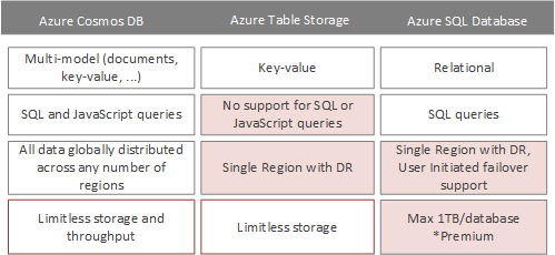 The following table shows the uncommon attributes of Azure Cosmos DB, Azure Table Storage, and Azure SQL Database.