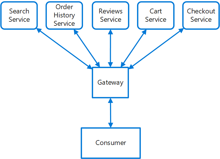 When a client needs to consume multiple services, setting up a separate endpoint for each service and having the client manage each endpoint can be challenging. For example, an e-commerce application might provide services such as search, reviews, cart, checkout, and order history. Each service has a different API that the client must interact with, and the client must know about each endpoint in order to connect to the services. If an API changes, the client must be updated as well. If you refactor a service into two or more separate services, the code must change in both the service and the client.