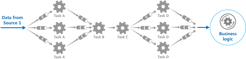 The filters that make up a pipeline can run on different machines, enabling them to be scaled independently and take advantage of the elasticity that many cloud environments provide. A filter that is computationally intensive can run on high performance hardware, while other less demanding filters can be hosted on less expensive commodity hardware. The filters don't even have to be in the same data center or geographical location, which allows each element in a pipeline to run in an environment that is close to the resources it requires. The next figure shows an example applied to the pipeline for the data from Source 1.